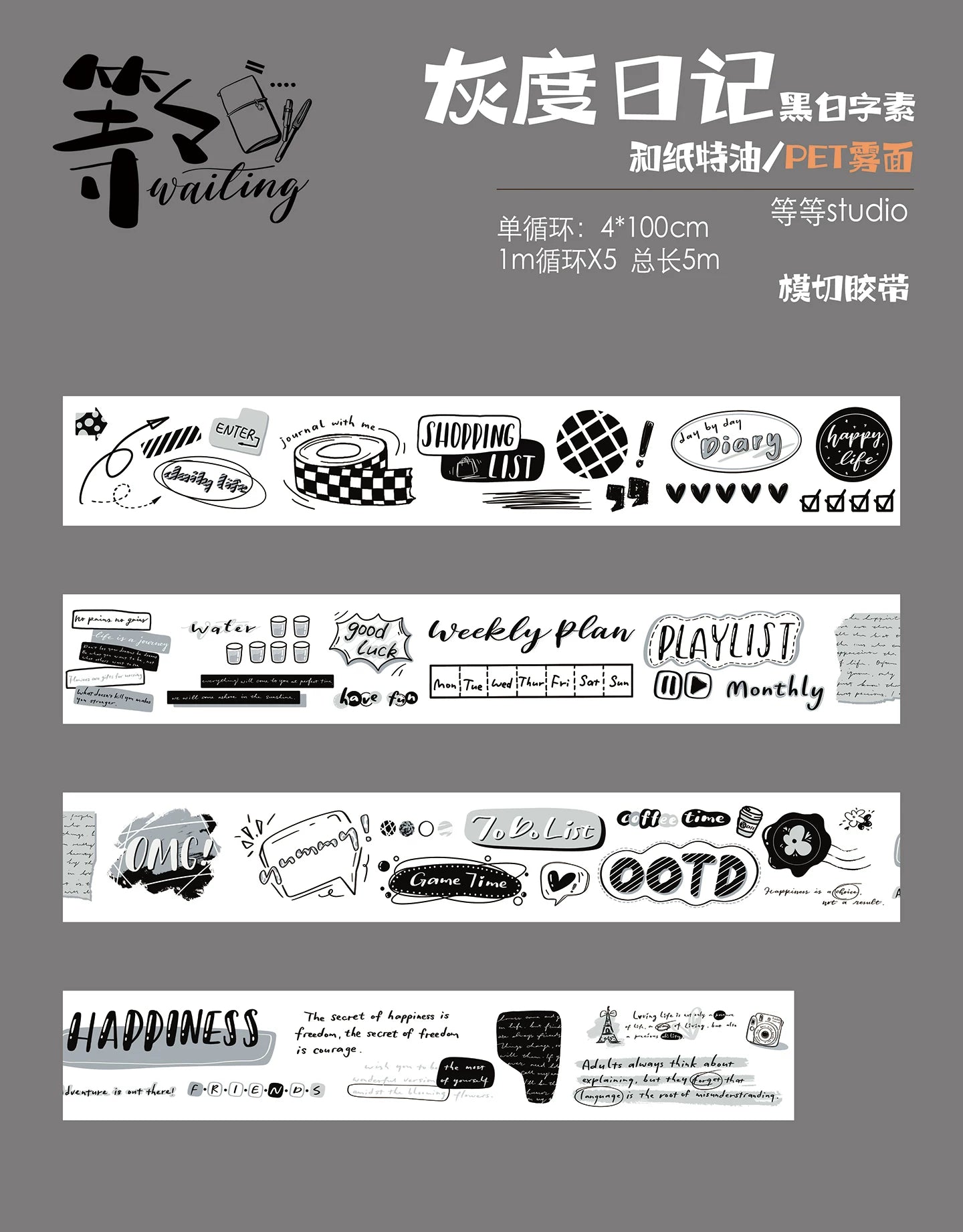 Wait Studio【Grayscale Diary】 Pre-cut Light Retro Black and White Text Washi/PET Tape
