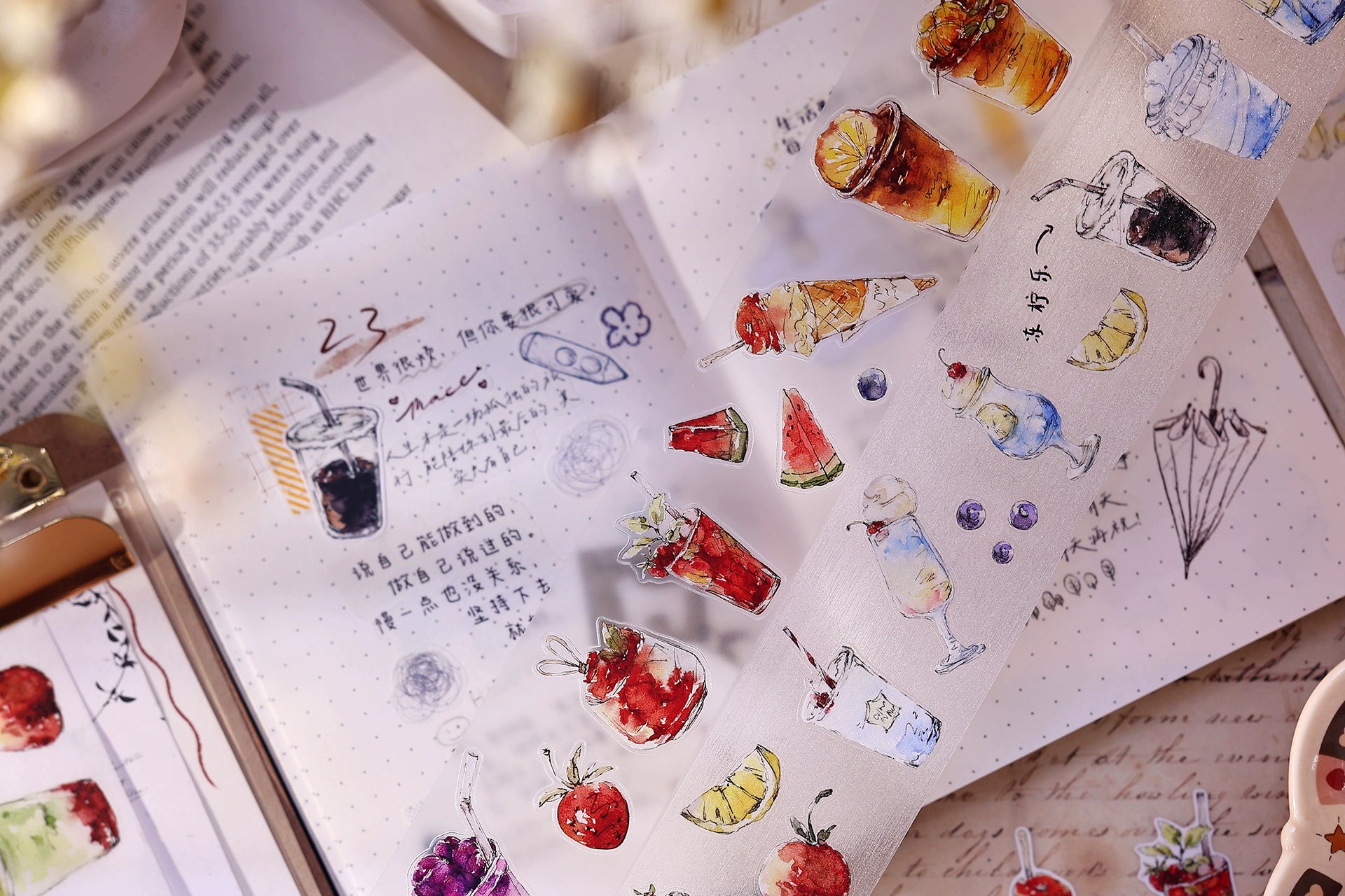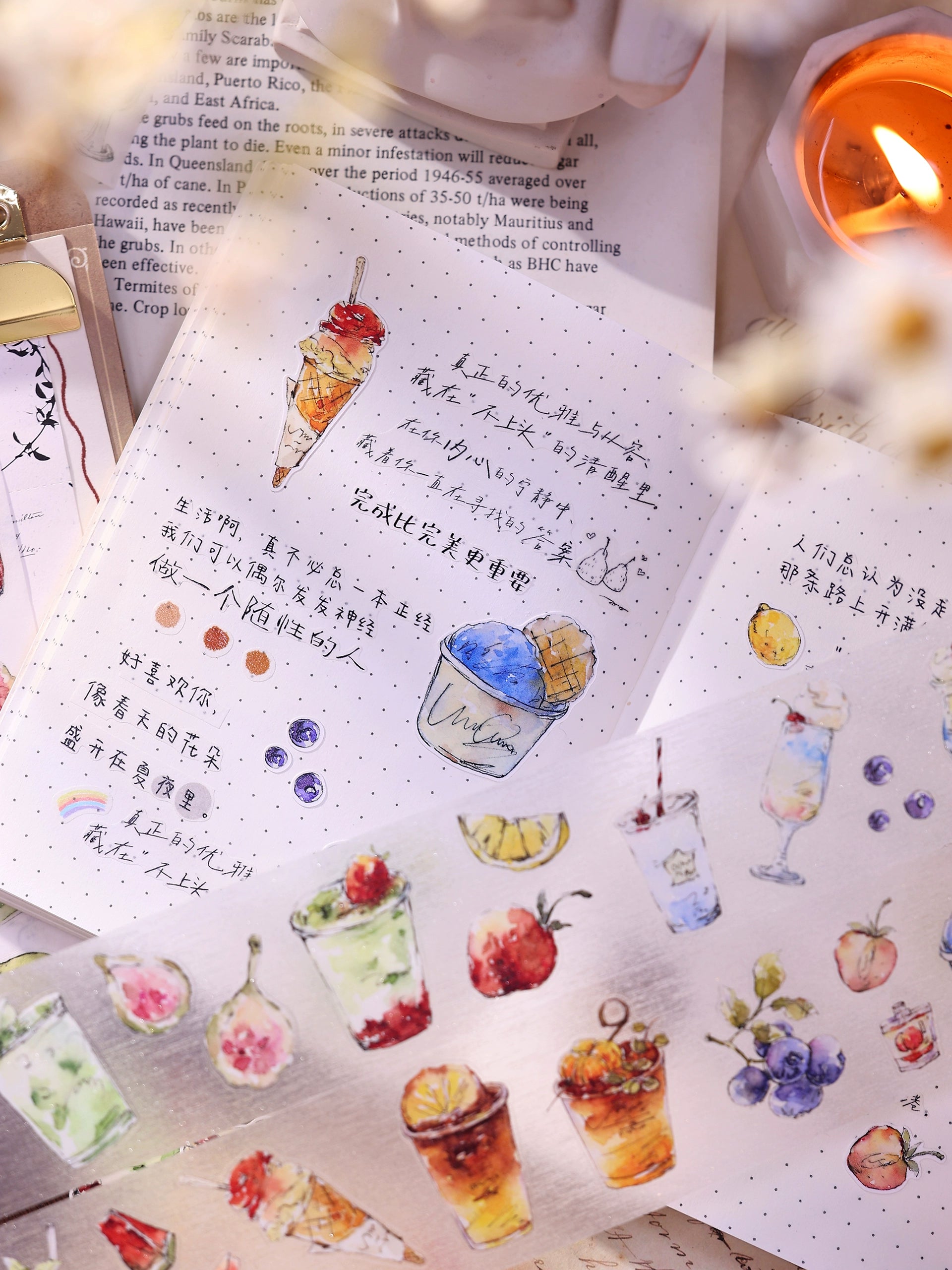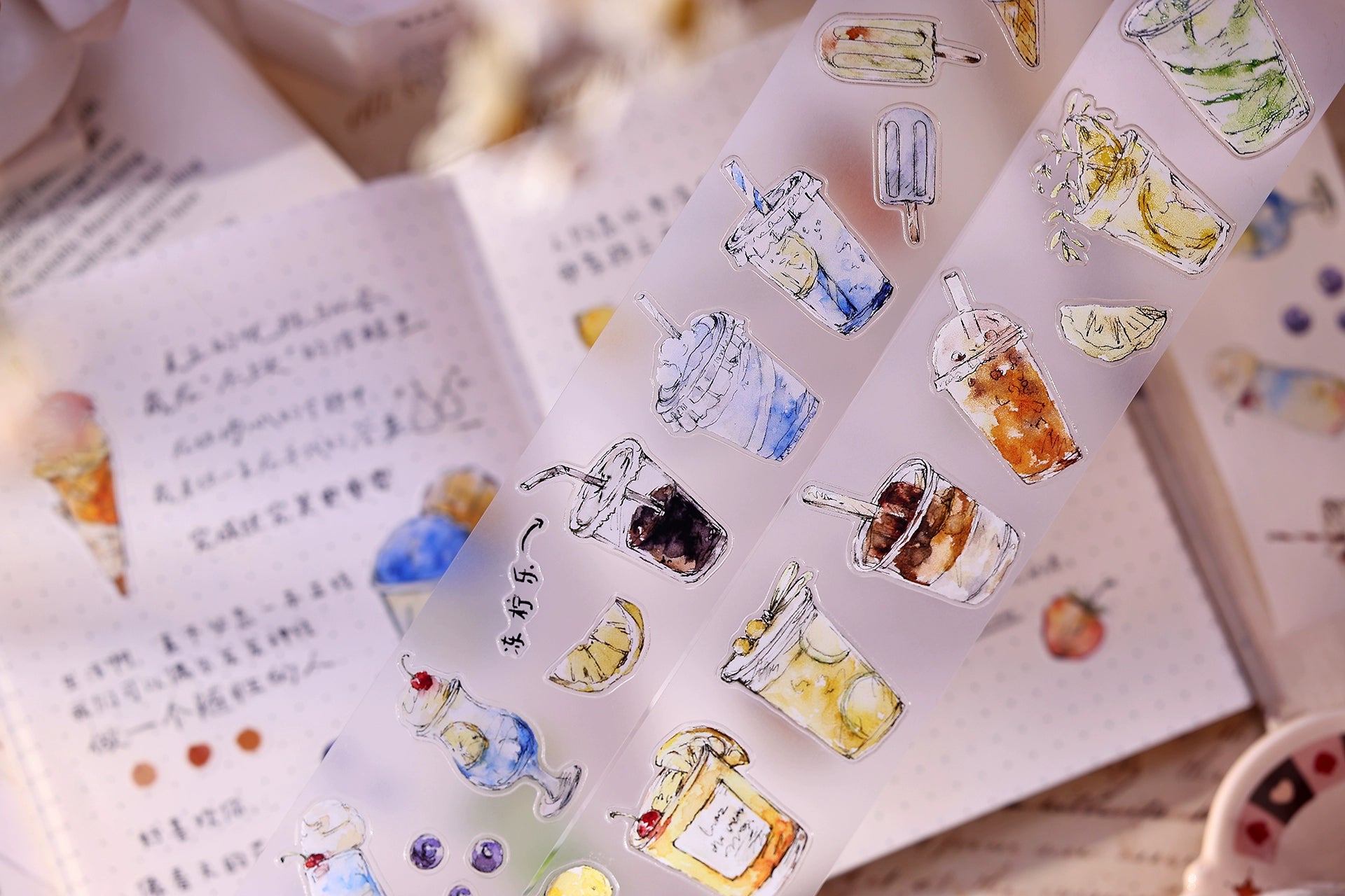 XiaoBaiJia Minimalist Style【Cool Summer】Drink Milk Tea,Pre-cut Light Retro Orginal Design Washi Pet Tape Landscape Stickers