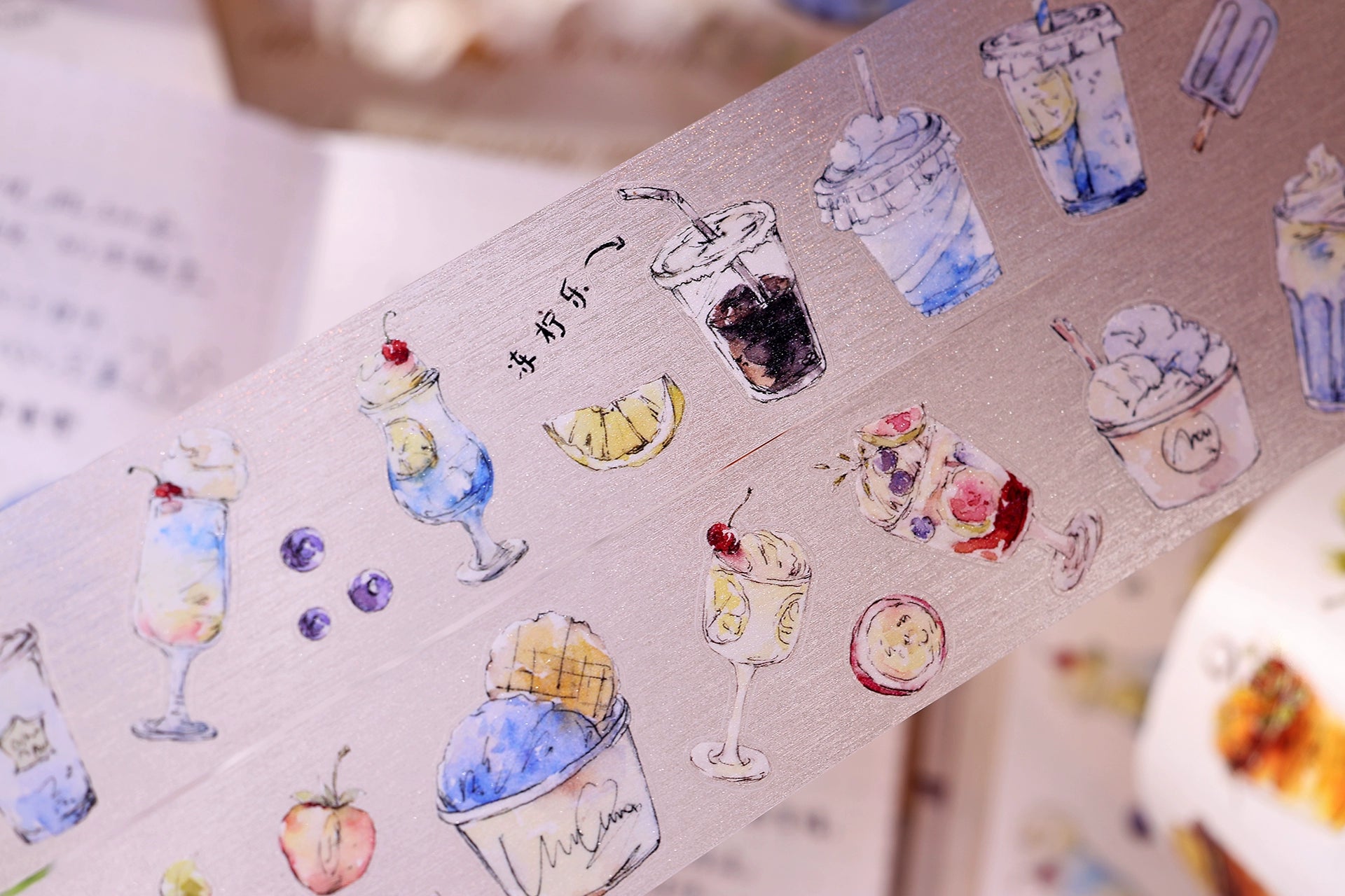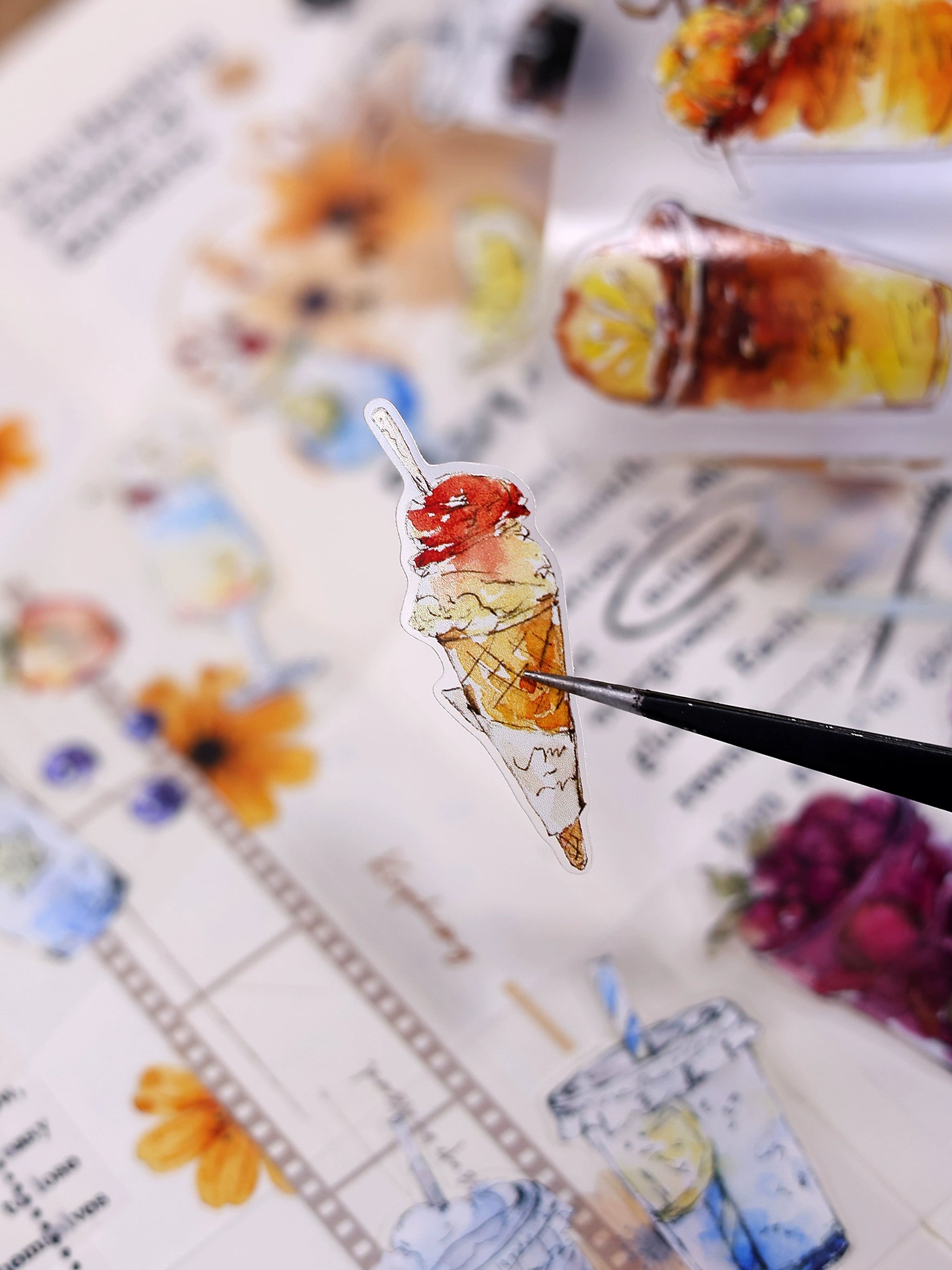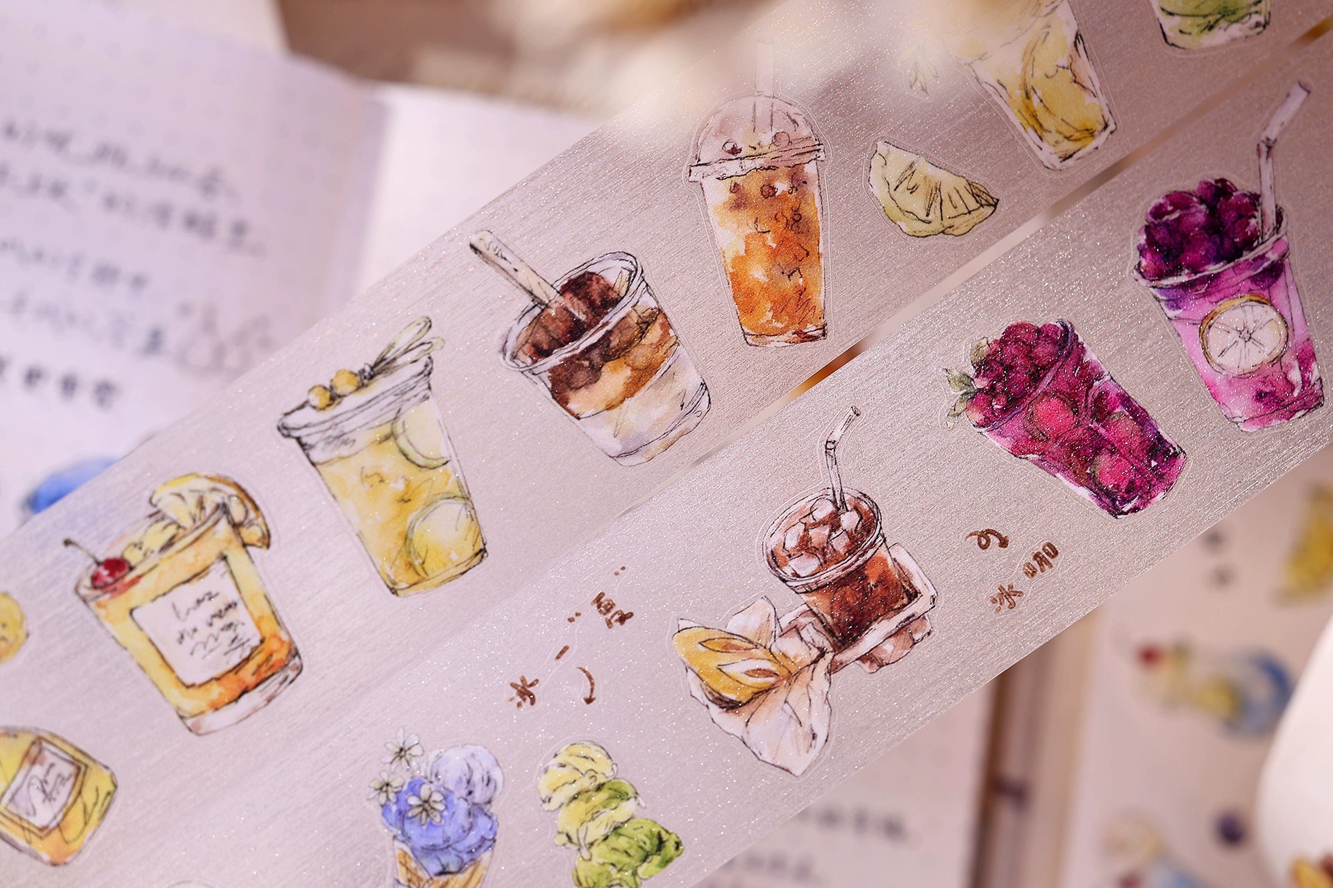 XiaoBaiJia Minimalist Style【Cool Summer】Drink Milk Tea,Pre-cut Light Retro Orginal Design Washi Pet Tape Landscape Stickers